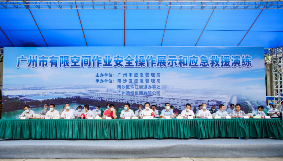 在公司领导的高度重视下,通过新产品分厂、办公室、人力资源部、采购部、生产部、物流管理部、园区发展部等部门的积极配合,广州市有限空间作业安全操作展示和应急救援演练于8月26日在公司成功举办。市应急管理局党委书记、局长黄彪、南沙区常务副区长谢明、恒峰g22国际集团副总经理谭思马和公司党委书记、董事长周耘出席了本次活动,各区应急管理局和珠江街主要负责人、市有限空间作业重点企业代表、恒峰g22国际集团安监部和各板块安全责任人及公司AB类部门共160余人现场观摩演练。